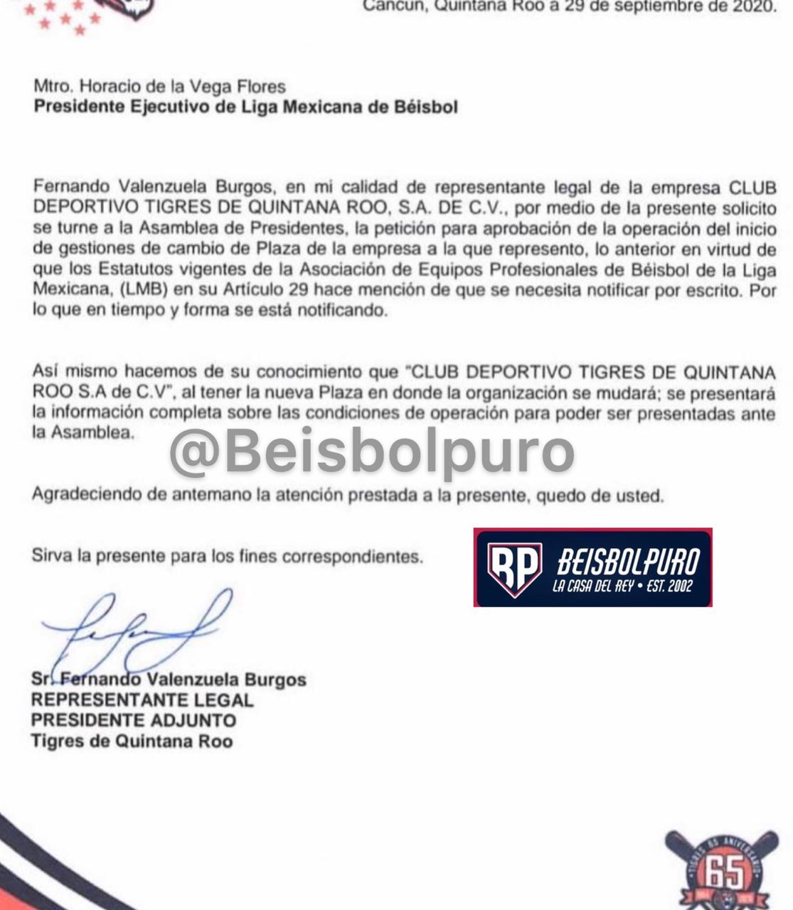 Firmada por Fernando Valenzuela Burgos, presidente adjunto y representante oficial de los Tigres, la petición de la organización indica que, una vez aprobada la petición de cambio de plaza, en cuanto tengan información de su nueva ciudad sede se la harán saber a la Asamblea de Presidentes del circuito veraniego, tal como lo marcan los estatutos de la LMB.